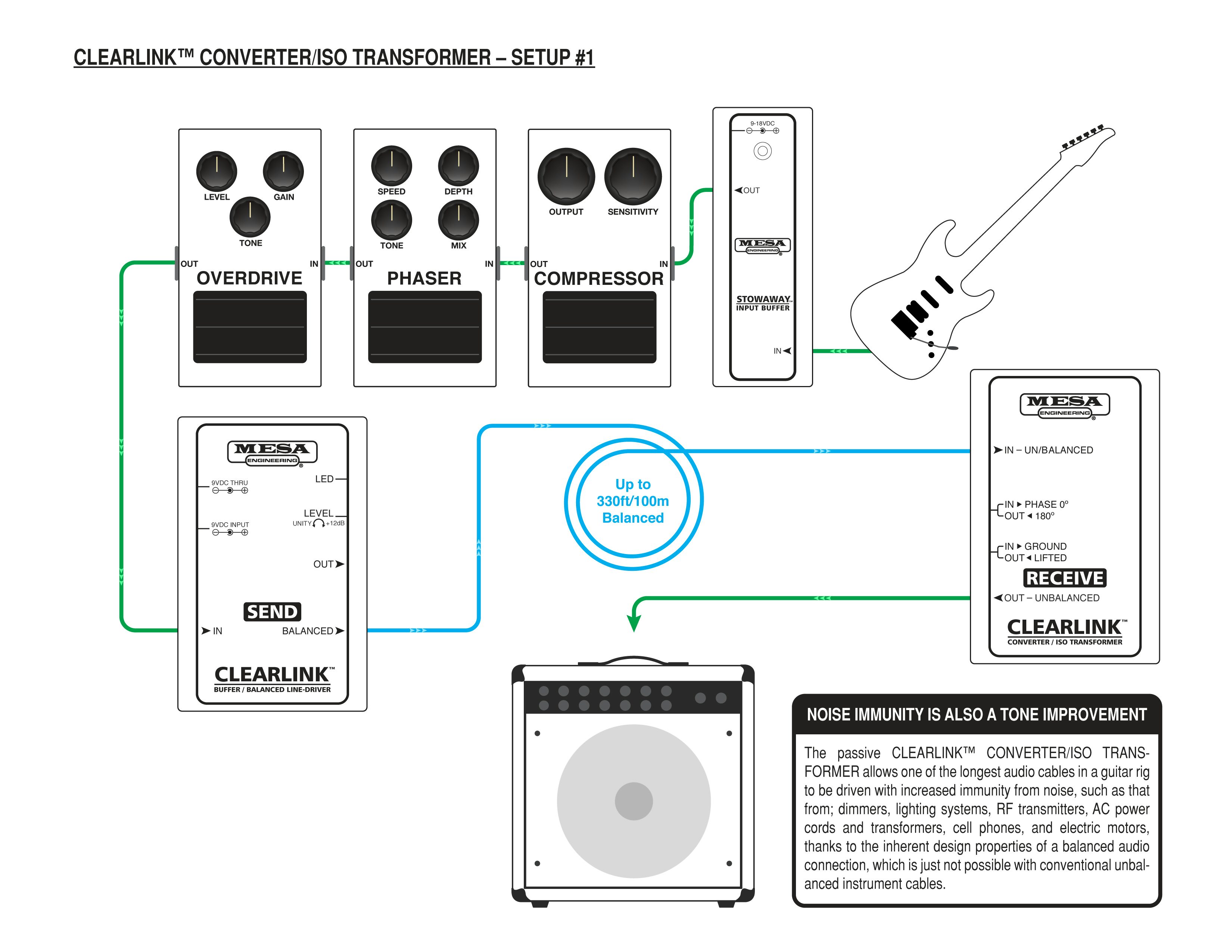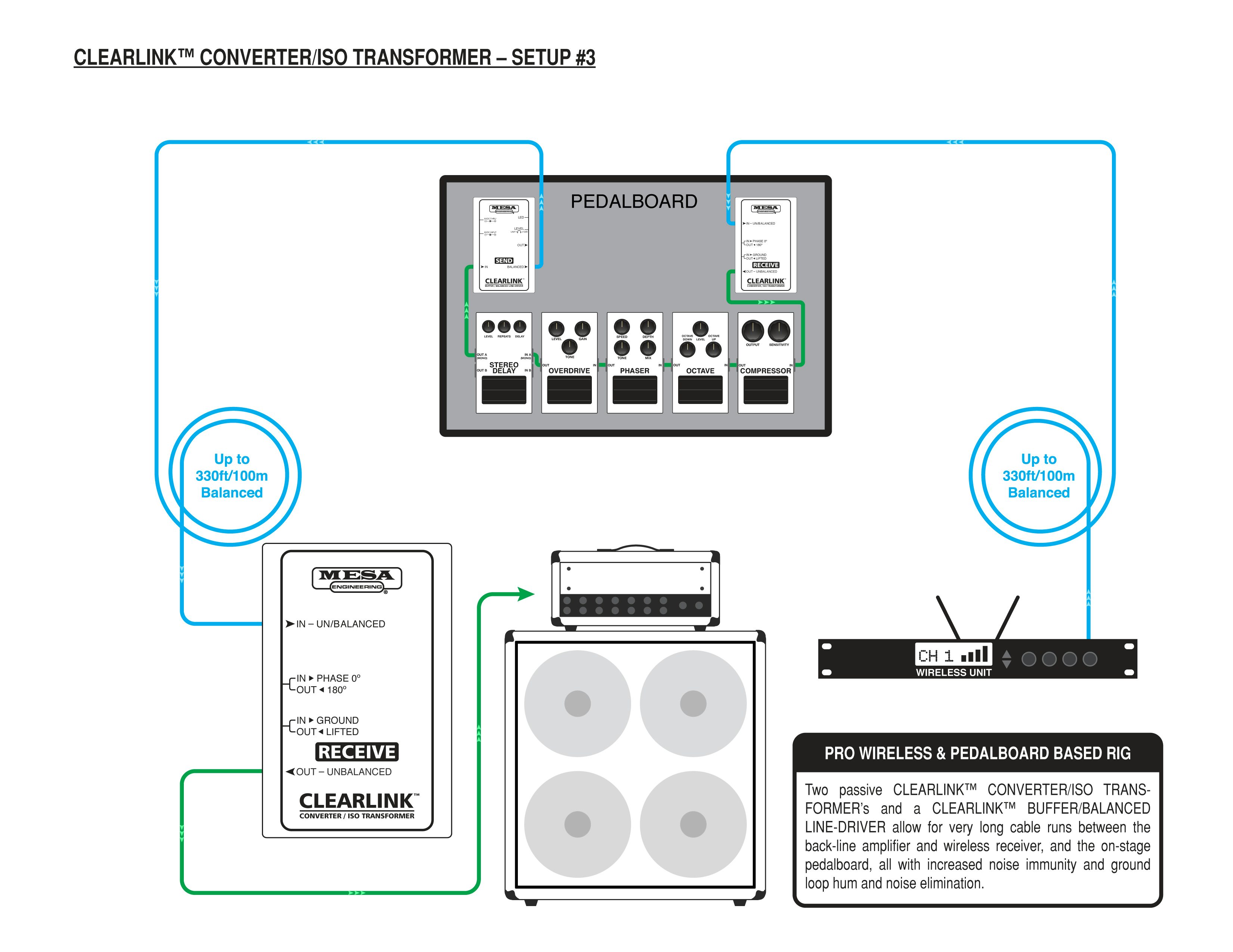 The CLEARLINK RECEIVE ISO/CONVERTER is the ultimate big stage solution for all instruments where signal must travel longer than 15 to 20 feet. It’s most common application is receiving a buffered signal through long cabling from its companion product–the CLEARLINK SEND–at the tail end of a Pedal Board and converting the XLR balanced signal that transmits back to a ¼” unbalanced signal appropriately matched for feeding an instrument amplifier. It can also be used to combat “Ground Loops” or for any isolation job where shared grounds create noise problems, such as a multi-amp switching setup, as well as any balanced XLR to ¼” unbalanced conversion. Along with Stage applications, the CLEARLINK RECEIVE is also well suited for the Studio, enabling a very long cable run from the Control Room to the Cutting Room, where an amplifier might be mic’d. This CLEARLINK features a Studio Quality Buffer circuit and Isolation Transformer, Ground Lift as well as Phase Flip switches rounding out its feature set for either of the previously mentioned scenarios. With the ability to isolate and convert from most pro signal sources, it’s a must-have for the gigging musician or Stage Tech. For the ultimate Tone protection in a Guitar rig, use a STOWAWAY™ before the Pedal Board, the CLEARLINK™ SEND at the end of it, and a CLEARLINK RECEIVE at your amplifier for the conversion and total reclamation of Tone.