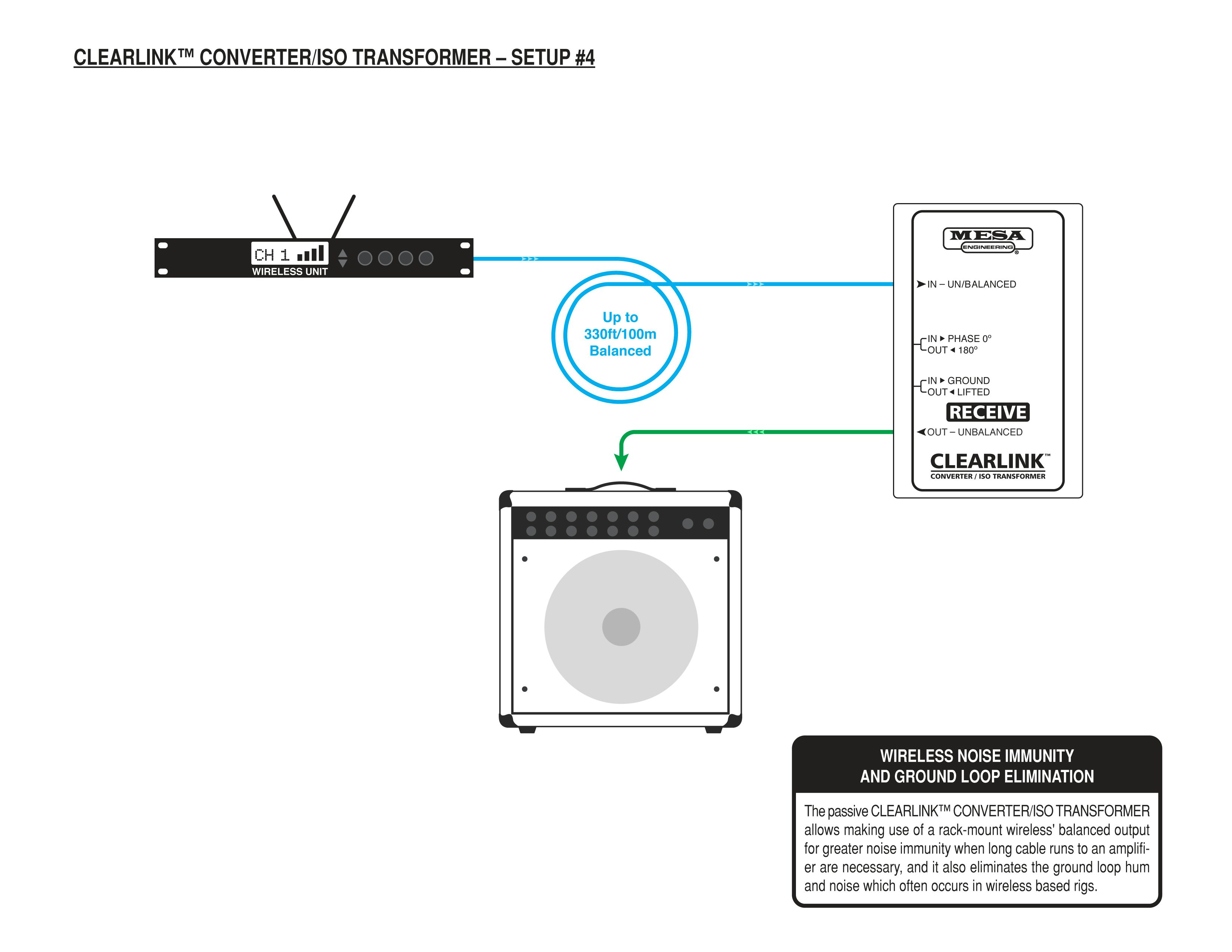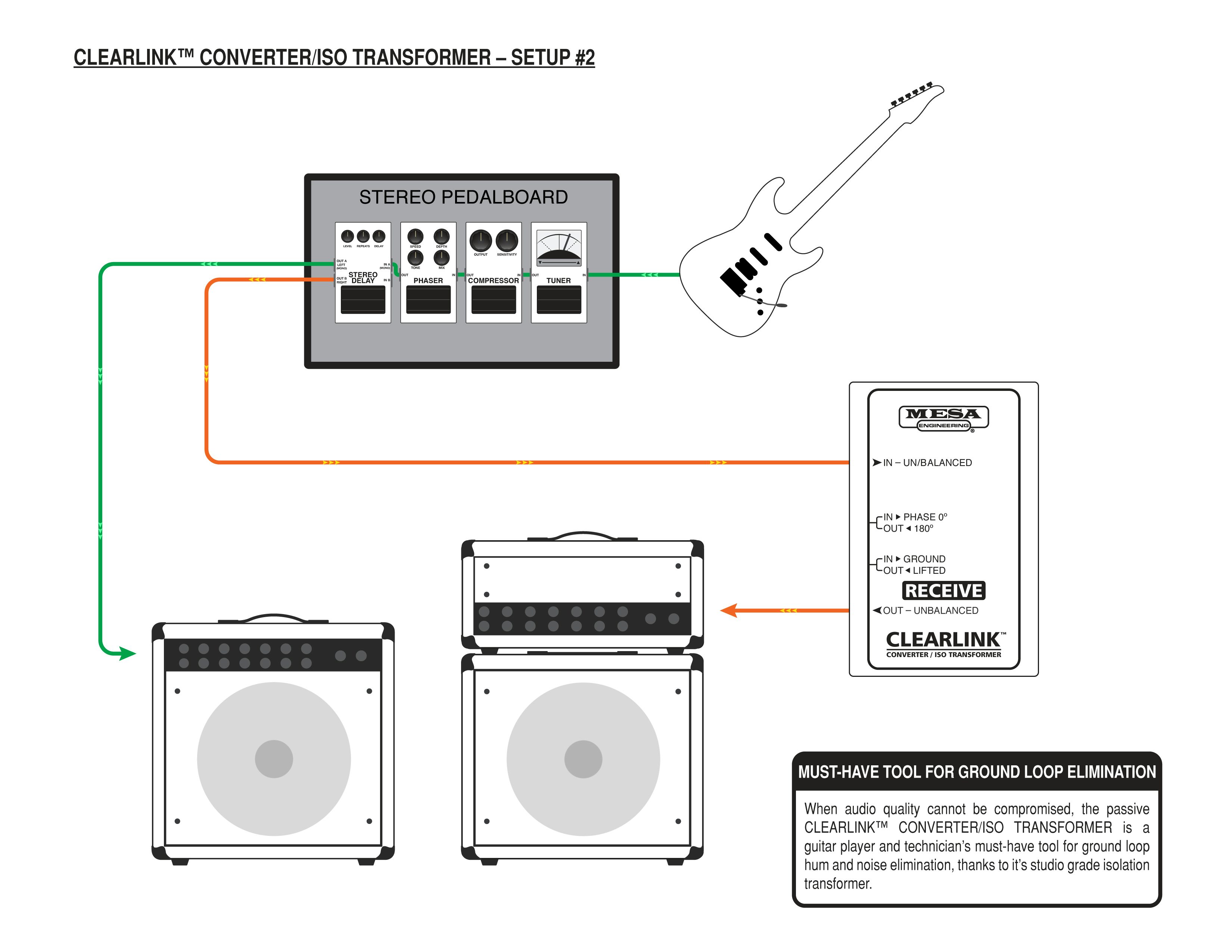 First, make sure that all the amplifiers are properly grounded with a 3-prong AC power-cord plug! Older amplifiers with 2-prong AC power-cord plugs should be checked for proper grounding, and if necessary, serviced before using them in a guitar rig. Defeating an amplifier’s safety ground may not only be ILLEGAL, but it may also pose a SHOCK or ELECTROCUTION HAZARD. That said, and as you’re probably already aware, the most common cause of buzz, hum, and noise when connecting multiple amplifiers in the same rig, is a ground loop. The isolation transformer inside the CLEARLINK™ RECEIVE and its GROUND switch, work together to safely eliminate a ground loop. With a CLEARLINK™ RECEIVE connected to the input of every amplifier in the rig, the GROUND switch on ONLY one CLEARLINK ™ RECEIVE should be set to the “IN” position, so it can “pass” its earth ground reference to any pedals, and the guitar. The GROUND switch on ALL the remaining CLEARLINK™ RECEIVE’s should be set to the “OUT” position, to eliminate the ground loops that would otherwise form. Try setting each GROUND switch to the “IN” position, individually, and use the combination which results in the least amount of buzz, hum and noise.