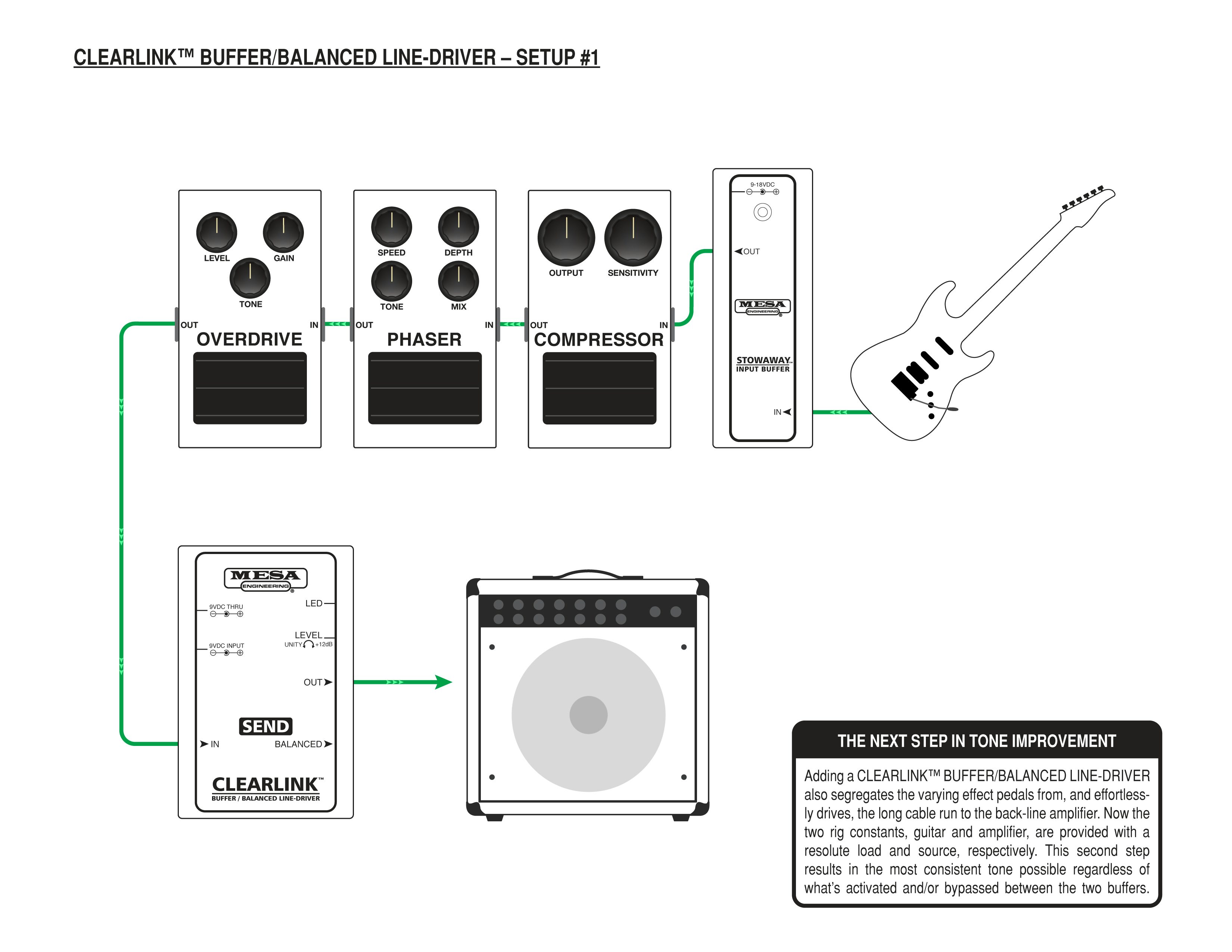 Theoretically you could, but we have another device which is much better suited as a guitar input buffer, the STOWAWAY ™ INPUT BUFFER. It is a 100% discrete Class-A circuit with an input impedance and other finely tuned characteristics which mimic that of a high quality tube amplifier, and it includes an RFI filter to minimize the possibility of radio-frequency interference and noise. It presents a dynamically ideal load to a guitar that remains steadfast, resulting in a tone that is consistent, while still allowing the guitar to breathe, live, and react - like plugging directly into the front of a tube amplifier. Alternatively, we also have a two-in-one device called the HIGH-WIRE™ DUAL BUFFER / OUTPUT BOOST which includes both circuits, plus a boost and tuner mute. Using the CLEARLINK™ SEND BUFFER/BALANCED LINEDRIVER in tandem with a STOWAWAY™ INPUT BUFFER resolves the deep-rooted signal loss and inconsistent tone issues faced by guitarists due to; capacitive loading, impedance loading and mismatching, and changes to a pickup’s resonant frequency/peak, as a result of varying effect pedals and interconnecting cables. They accomplish this by providing the two constants in every guitar rig, the guitar and amplifier, with a resolute load and source, via the STOWAWAY™ and the CLEARLINK™, respectively. The two form an effects loop, which segregates the guitar and amplifier from the variables on a pedalboard, easily handles many pedals, interconnecting cables, and effortlessly drives a long cable run to the back-line amplifier, either balanced or unbalanced. As a result, the only variations in sound and tone will be from the actual effect of the pedals on the pedalboard, and not from a guitar or amplifier related loading or impedance mismatch issue.