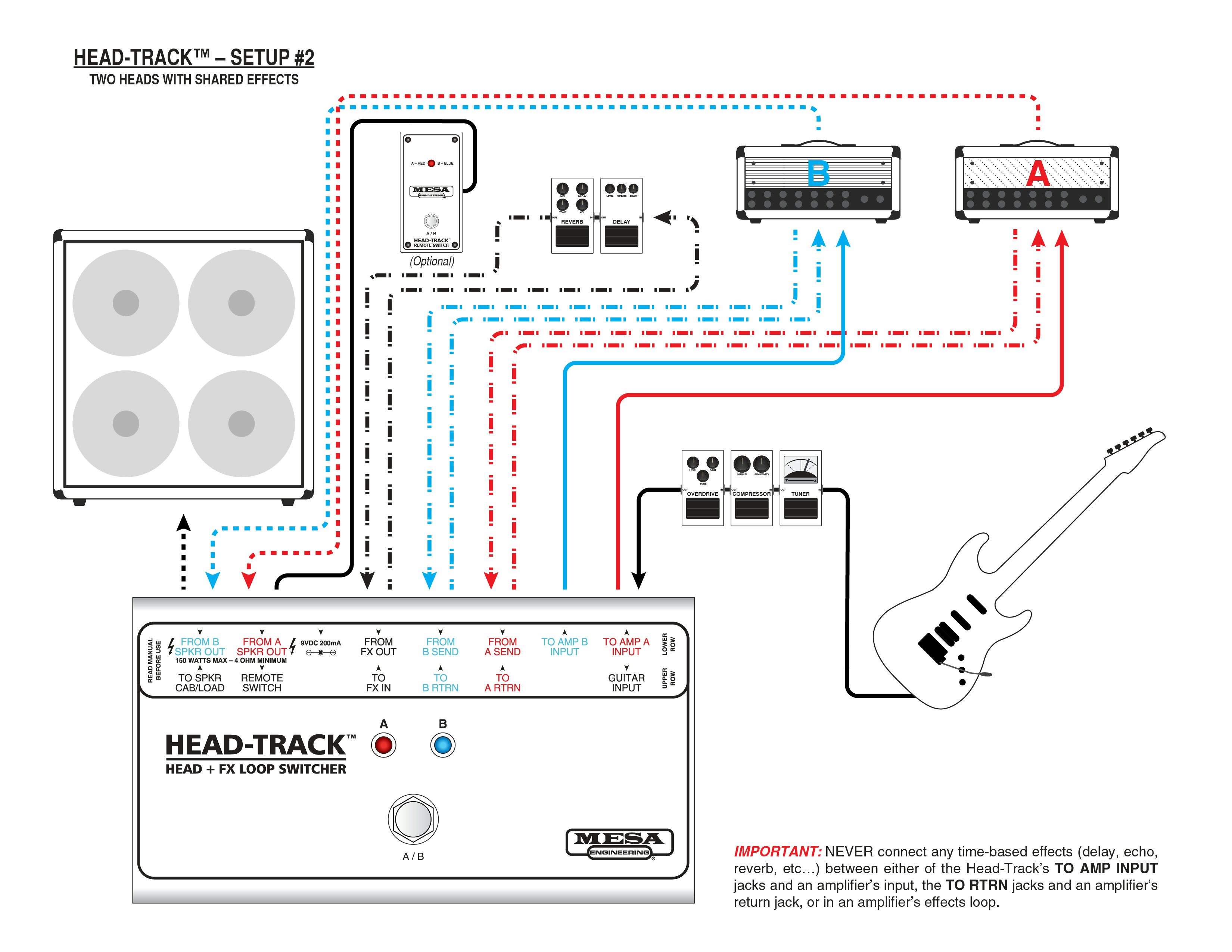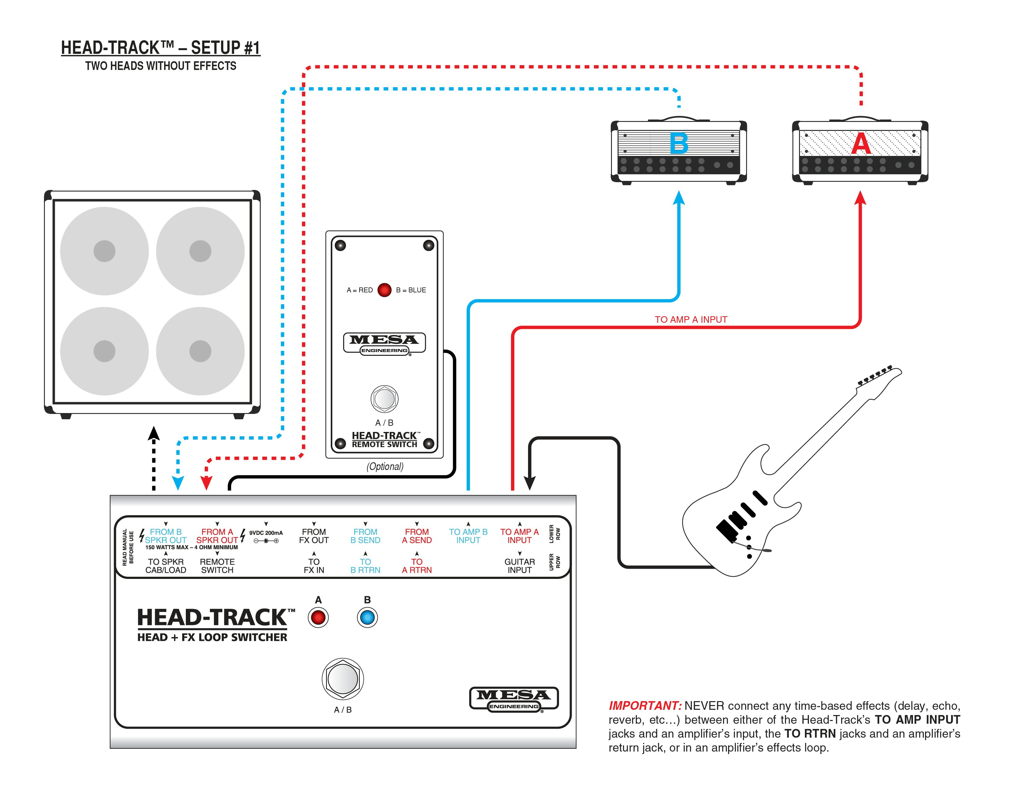 The Head-Track™ gives you the ability to instantly select between two amplifiers, yet employ the same Speaker Cabinet and Effects setup. It is intended for use near the amplifiers being switched to maintain the shortest Cable lengths, thereby protecting the integrity of your signal, and has a Remote Switch jack so that a simple On/Off MIDI switching function, or Latching Footswitch located on your pedal-board, can control the switching. There is also an on-board Footswitch to switch between the two amps from the unit itself in the rare instance where the Head-Track might be used on the Pedal-Board.