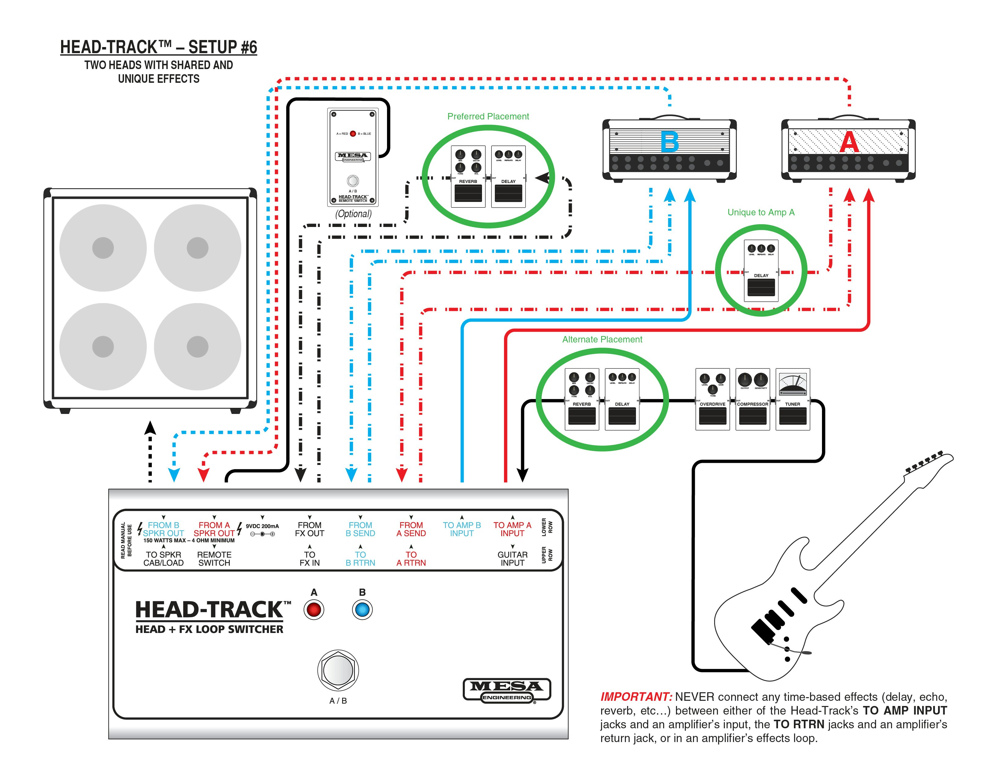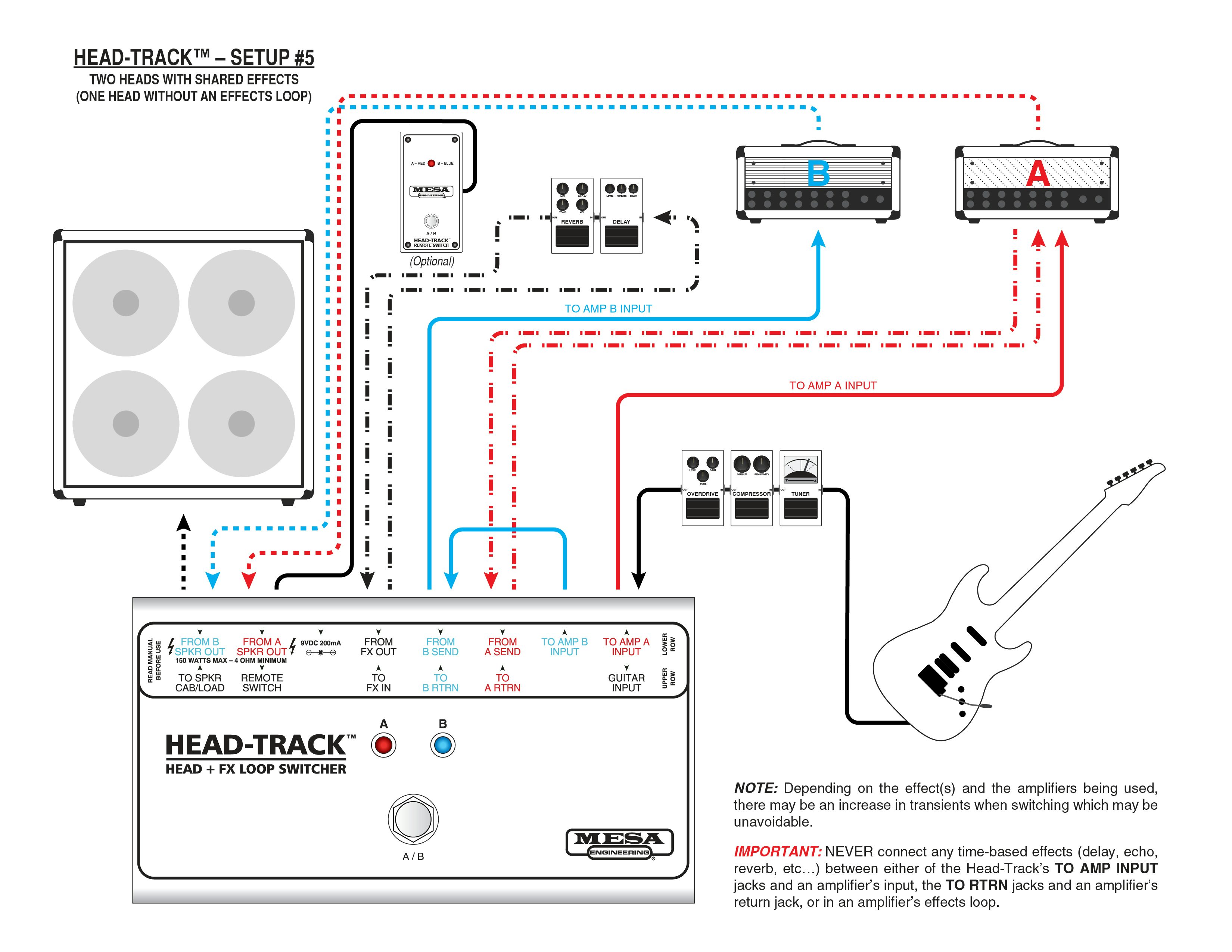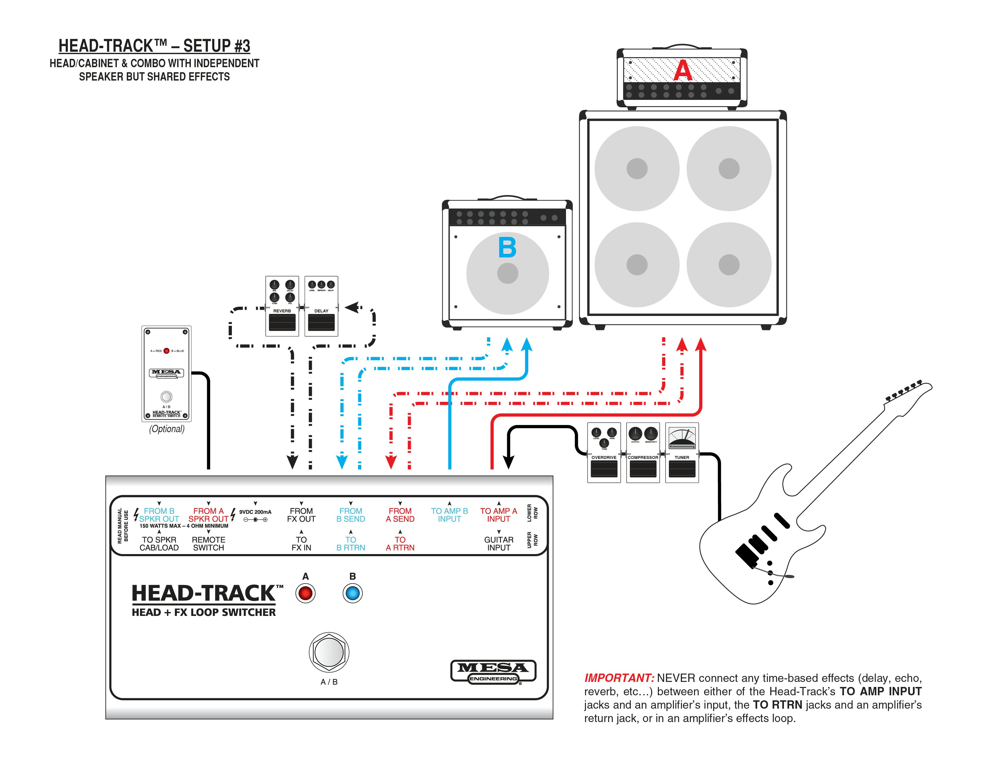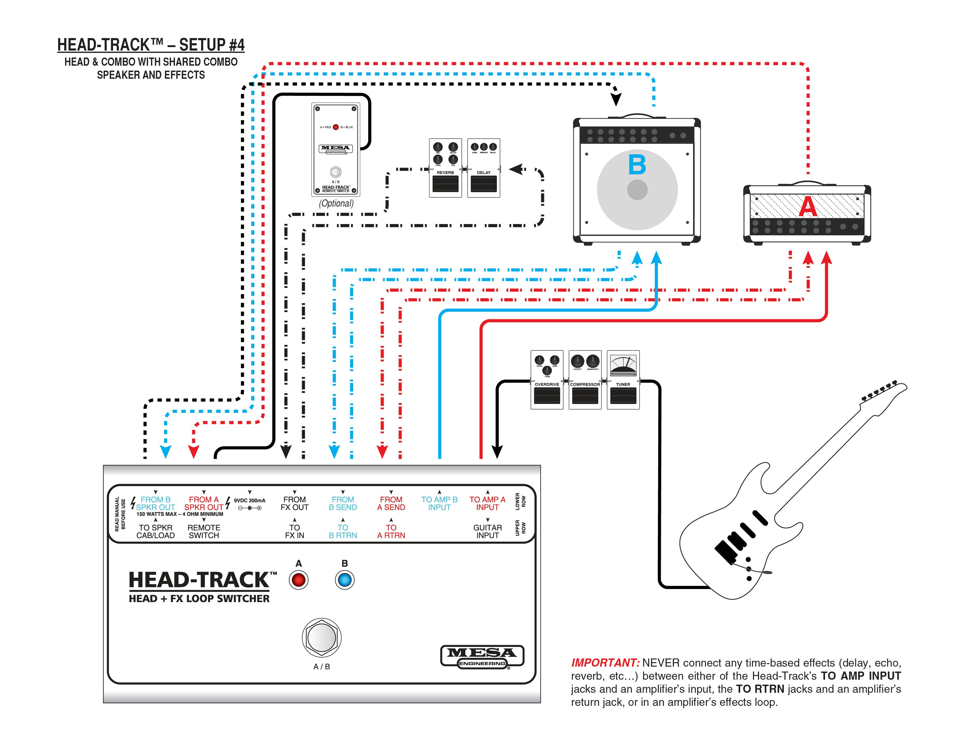 INPUTS from Instrument, Amplifier Effects Loop Sends (2), Effect(s) Output and Amplifier Speaker Outputs (2) along with OUTPUTS to Amplifier Inputs (2), Amplifier Effects Loop Returns (2), Effect(s) Input and the Speaker Cabinet Input (or Load Device) being shared are provided. The Head-Track can be powered by an external 9 Volt DC/200 mA wall-mount power supply (not included).